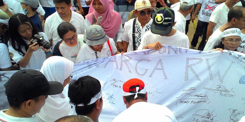 Menggunakan kaus putih bertuliskan "Bogor" yang dicoret silang merah, warga beramai-ramai berjalan kaki sambil membentangkan spanduk yang dipenuhi tanda tangan warga sebagai petisi dukungan pindah wilayah ke Kota Bekasi.